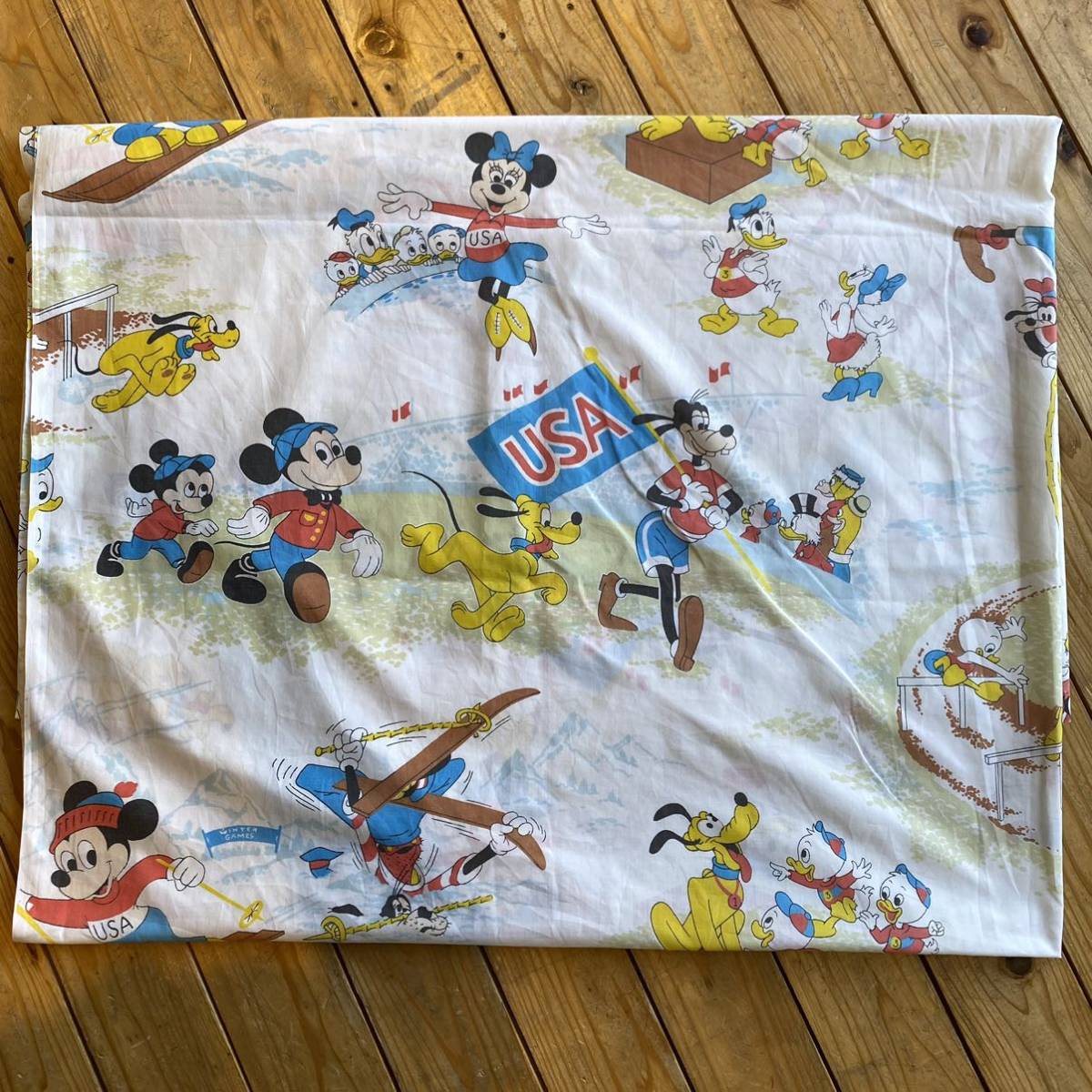 - 希少 USAヴィンテージ ベッドシーツ リメイク生地 素材 フラットシーツ ディズニー Disney オリンピック 冬季 アメリカ仕入 総柄 B1518