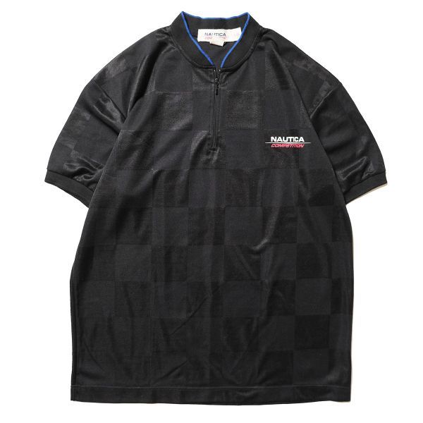 - 90's ノーティカ 単色 市松模様 ロゴ プリント ハーフジップ Tシャツ 半袖 (L) 黒 ジャージトップ NAUTICA 90年代 旧タグ オールド Y2K
