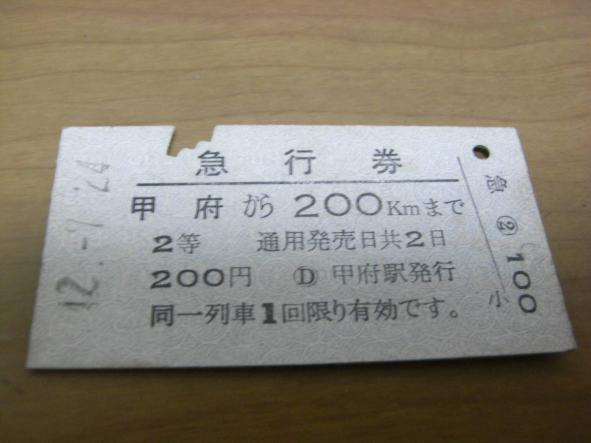 - 急行券 甲府から200kmまで 2等200円 昭和42年7月24日 甲府駅発行