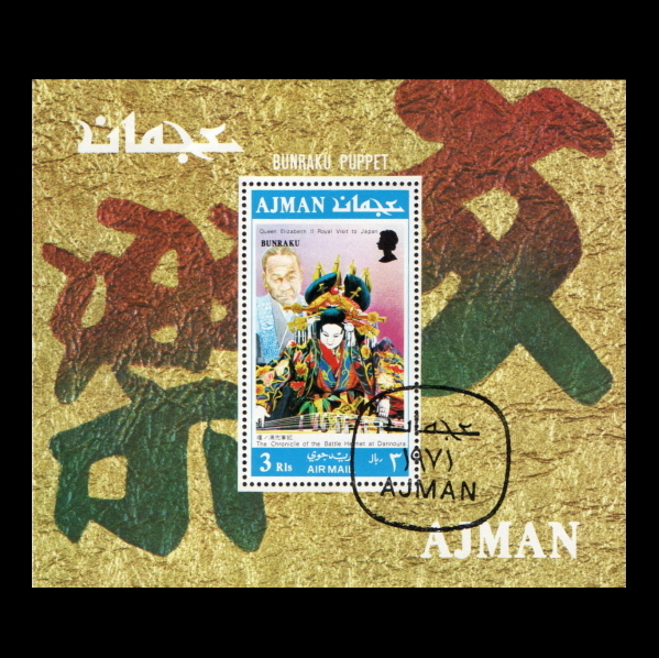 - ■アジュマーン(アラブ首長国)切手 1971年 エリザベス女王訪日記念 / 日本文楽 初日シート