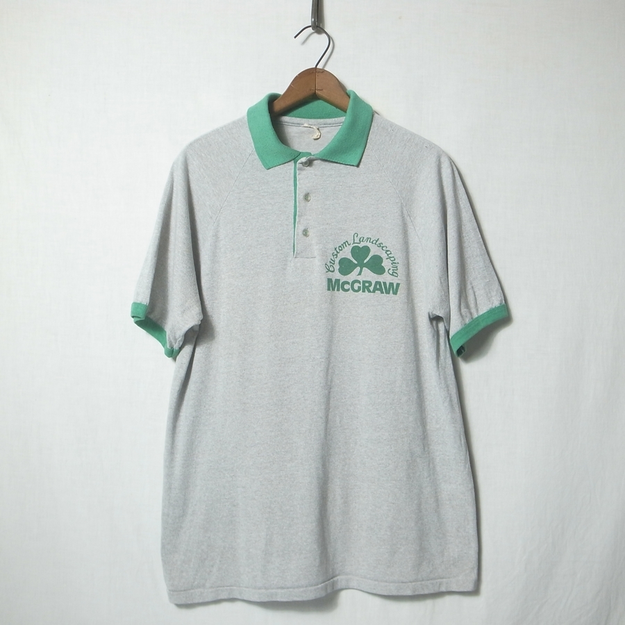- 80s ヴィンテージ クローバー プリント ポロシャツ グレー×グリーン / 70s USA 古着 カレッジ