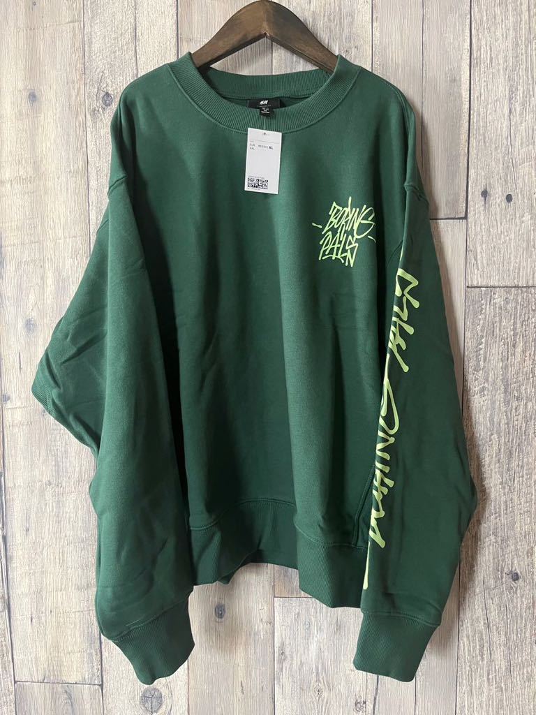 > ■新品即決■ H&M スウェットトレーナー スリーブプリント グリーン系 袖プリント オーバーサイズ XL ソフト裏起毛 ドロップショルダー