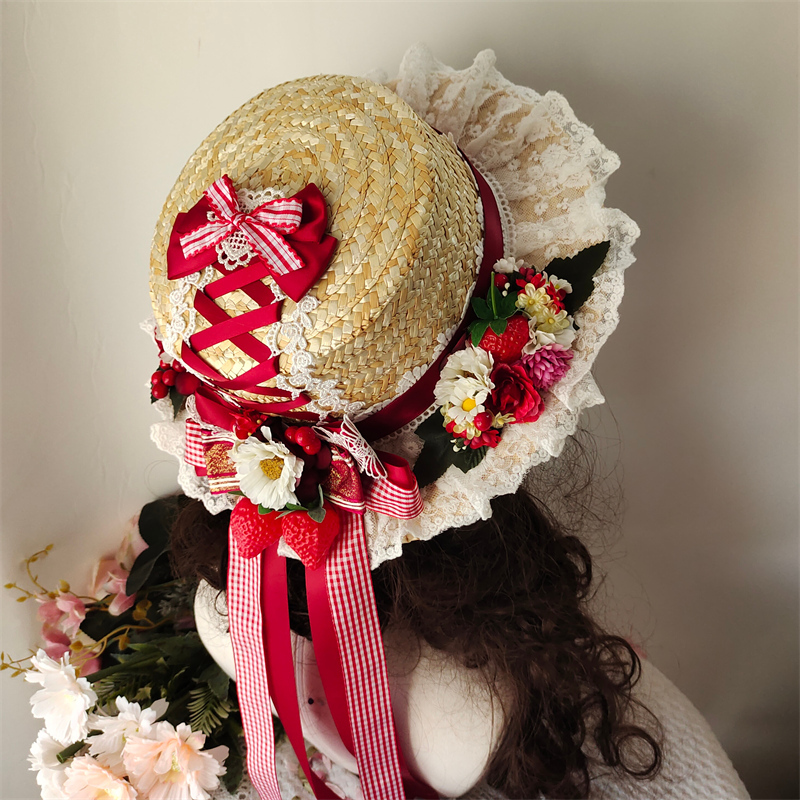 - ロリータ 麦わら帽子 ロリィタ 豪華 ハンドメイド 日除け 夏 コスプレ レディース 甘ロリ ハット 萌え 清楚 かわいい 舞台 パーティー