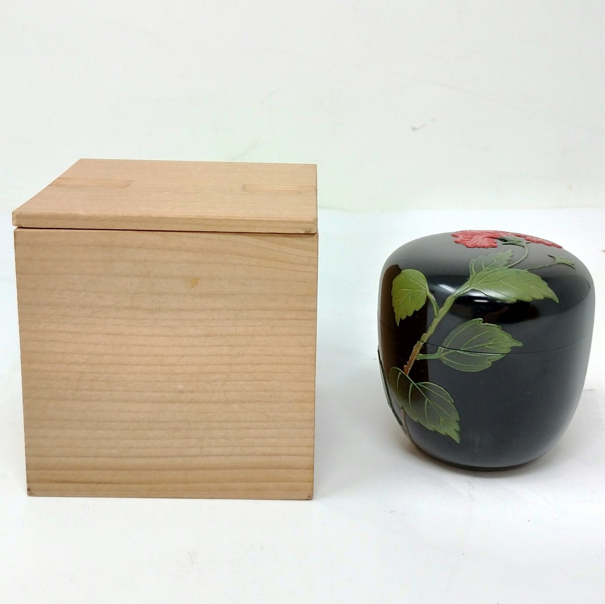 - J306【琉球漆器 沖縄 紅房 べんぼう 堆錦 棗】ハイビスカス 天然木 漆 茶道具《茶道家からの引取品》