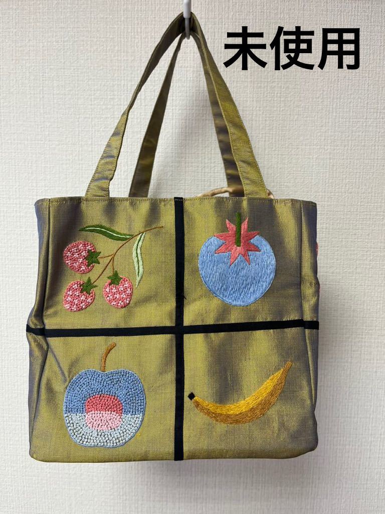 - 未使用◇果物刺繍 トートバッグ◇着物バッグ◇グリーン