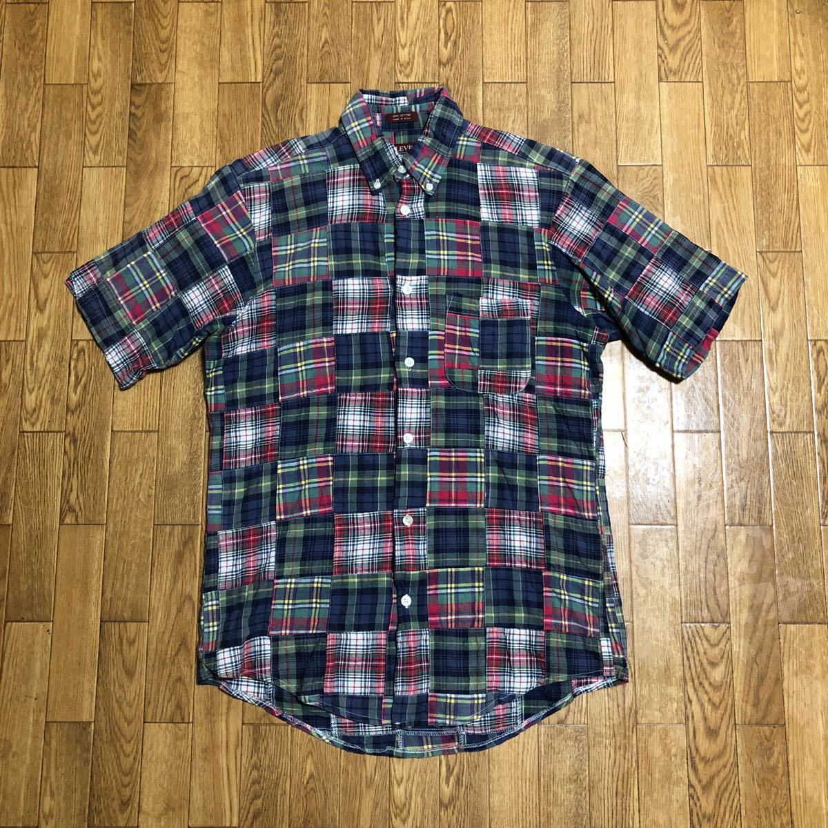 > 80〜90s USA製 CLEVE パッチワーク 半袖シャツ チェック 赤 緑 Sサイズ 古着 ヴィンテージ BD ボタンダウン