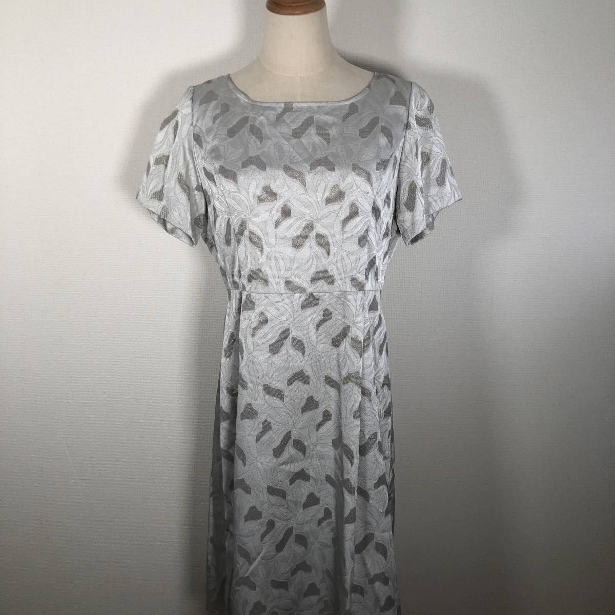 - WS0148 美品 全日本婦人子供服工業組合連合会 レディース ひざ丈ワンピ 半袖 ふわ 15AR シルバー(銀) 総柄 ポリエステル 昭和レトロ ラメ