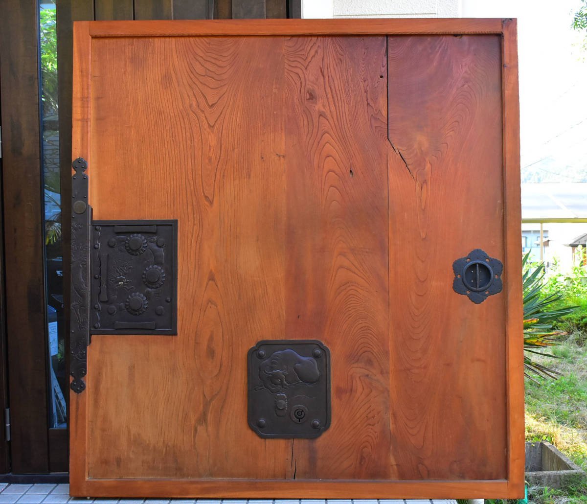 庄内 蔵戸 カラクリ錠前 極厚金具 金工 中山堂造 龍 寝牛 鍵付き 欅無垢材 大型 鶴岡豪商の蔵 当時物 骨董 建具