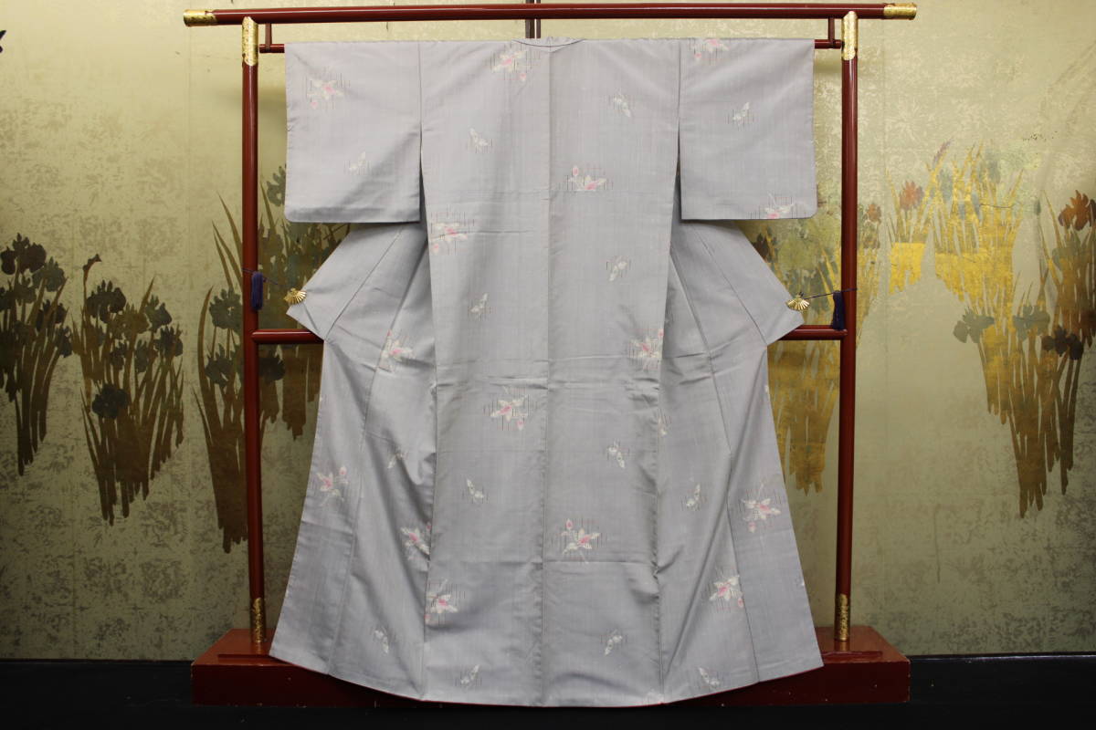 > きもの今昔5659 紬のきもの 十日町紬 グレー色地縦糸にネップ入り白抜き花絣 井穴で綺麗美品 身丈160cm