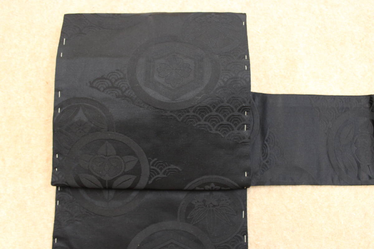- きもの今昔5667 黒の礼装 喪服用名古屋帯 正絹緞子地 青海派バックに丸文様柄入り シツケ糸付き未使用品