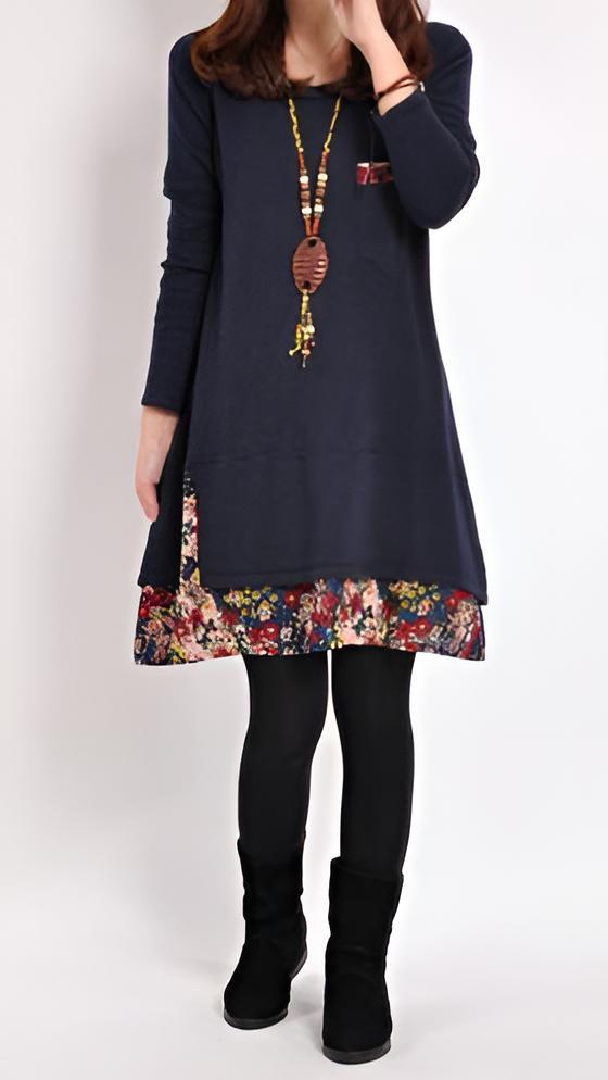 - 7-6-1.チュニックワンピ 膝丈 ゆったり カジュアル 花柄 ネイビー L