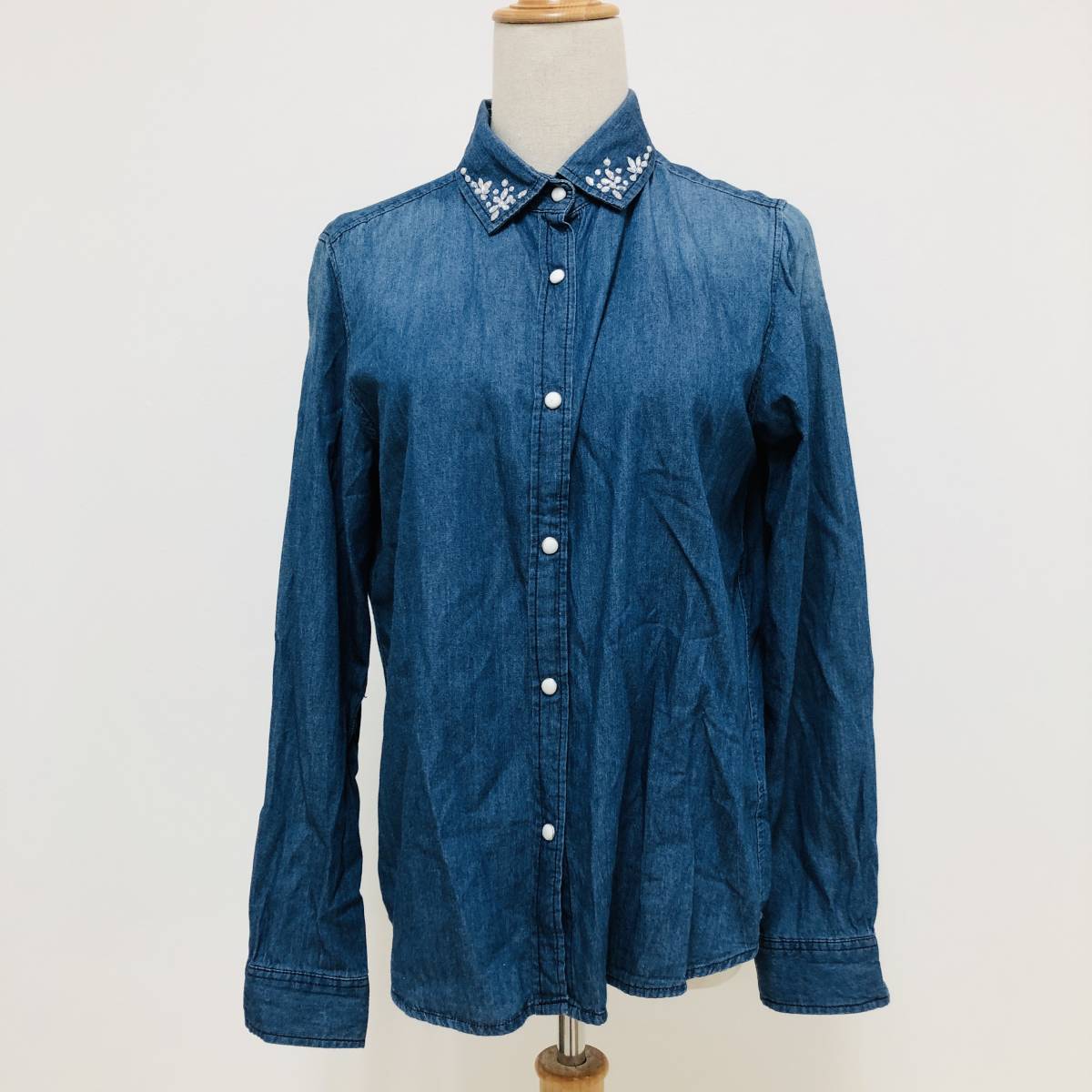 > k0653 HK WORKS LONDON しまむら シャツ デニム 長袖 綿100% ビジュー 薄手 スナップボタン L レディース 万能 カジュアルデニムコーデ