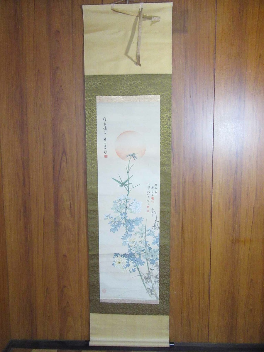 - 掛軸(模写):「蜻蛉と菊花図」根本憔谷補筆/J-230838★