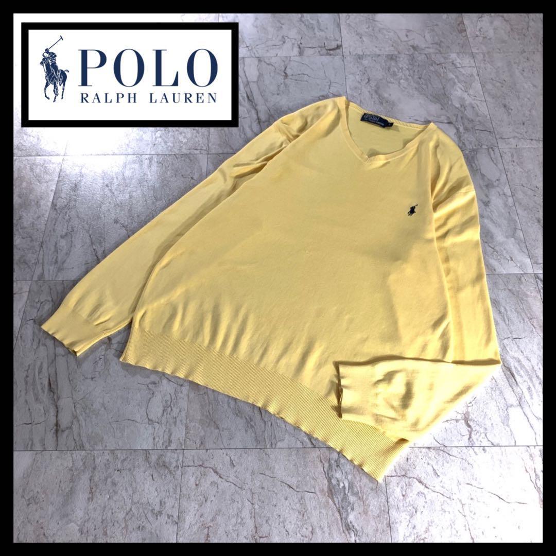 - 90s ラルフローレン ピマコットン Vネック ニット 薄手 黄色 L 刺繍