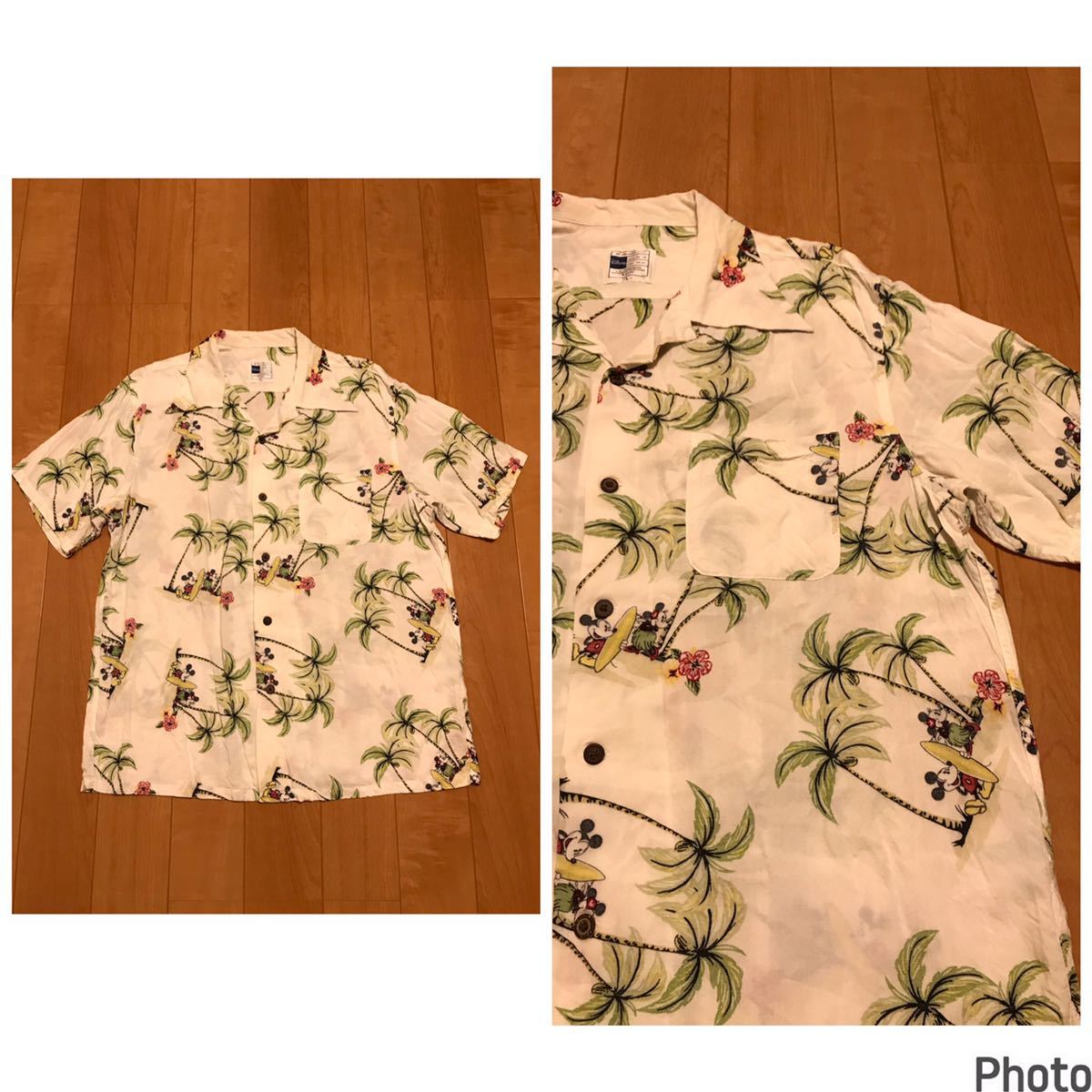 - 良品☆正規品 Disney/ディズニー・ミッキー&ミニー メンズサイズL 半袖希少.レーヨンアロハシャツ 裏使い生地 Mickey&椰子の木総柄 白