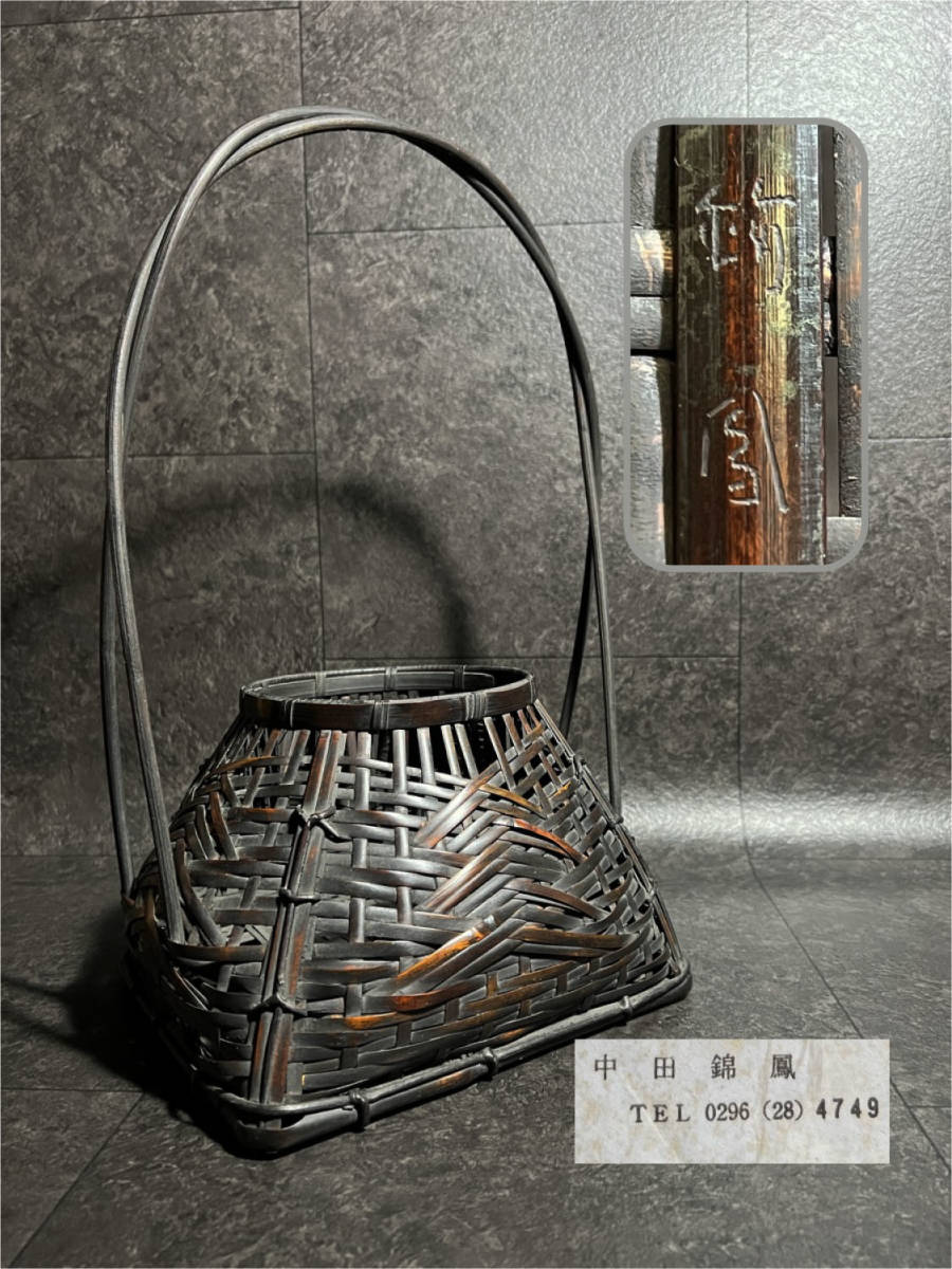 『【中田錦鳳 作】煤竹網代編 高40cm 竹製 竹編籠花入 茨城県作家 茶道具 コレクション アンティーク 』