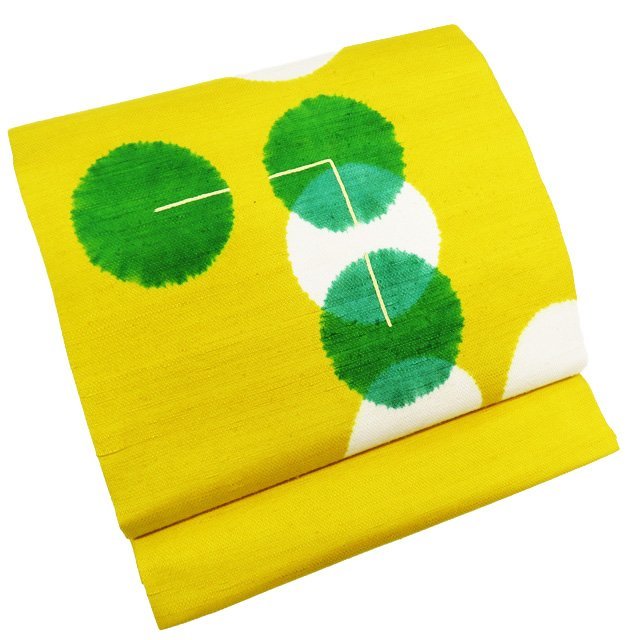 - 特選 開き名古屋帯 中古 リサイクル 紬地 カジュアル 正絹 仕立て上がり お太鼓柄 三越扱い 絞り染め 藤黄色 多色 きもの北條 A925-8