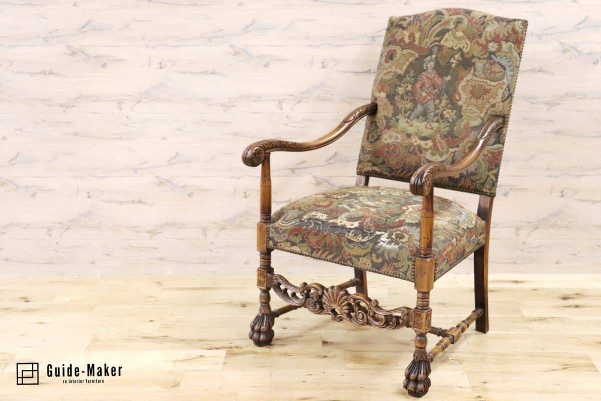 - GMGH200B○神戸家具 英国 アンティーク アームチェア 椅子 オーク材 鋲打 ファブリック オールド カントリー ヴィンテージ 定価18.1万