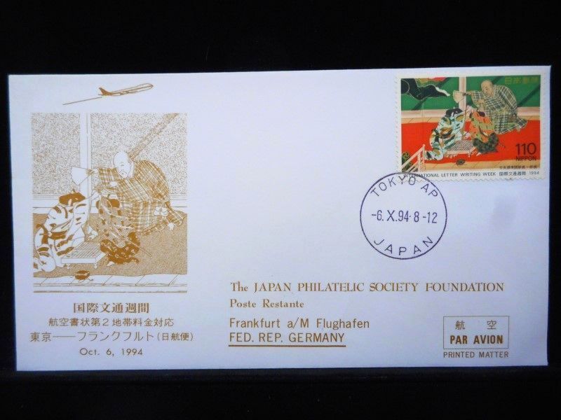 - 国際文通週間航空便実逓(2) 東京フランクフルト 1994年10月6日 TOKYO AP 初日カバー FDC 日本切手 G-443