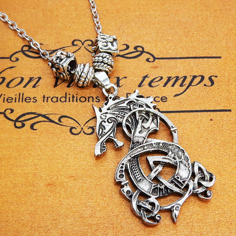 - アンティークシルバー ドラゴンモチーフのペンダントネックレス 模様刻みチェーン ゴシック パンク メタル 龍 長さ調整可