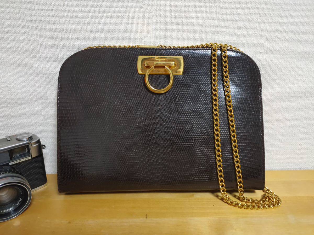 - 本物美品【フェラガモ】FERRAGAMO ガンチーニ リザード 茶色 チェーンショルダーバッグ 即決