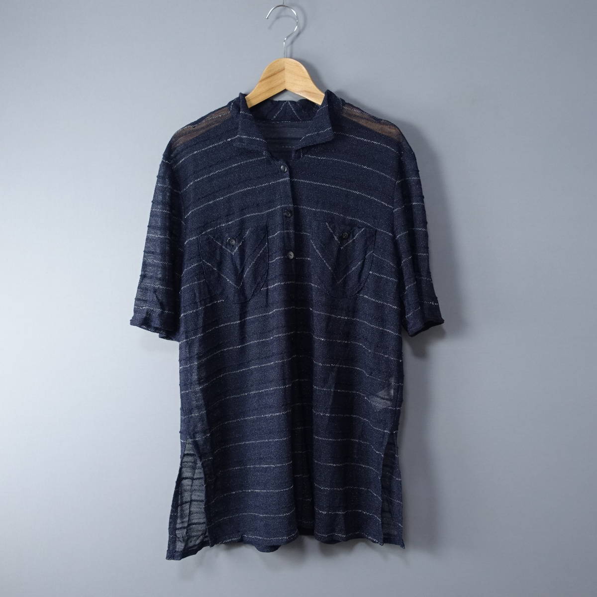- Leilian/レリアン/9/日本製/ストレッチ/リネン混シャツ/ネイビー/紺/レディース/ブラウス/トップス/半袖
