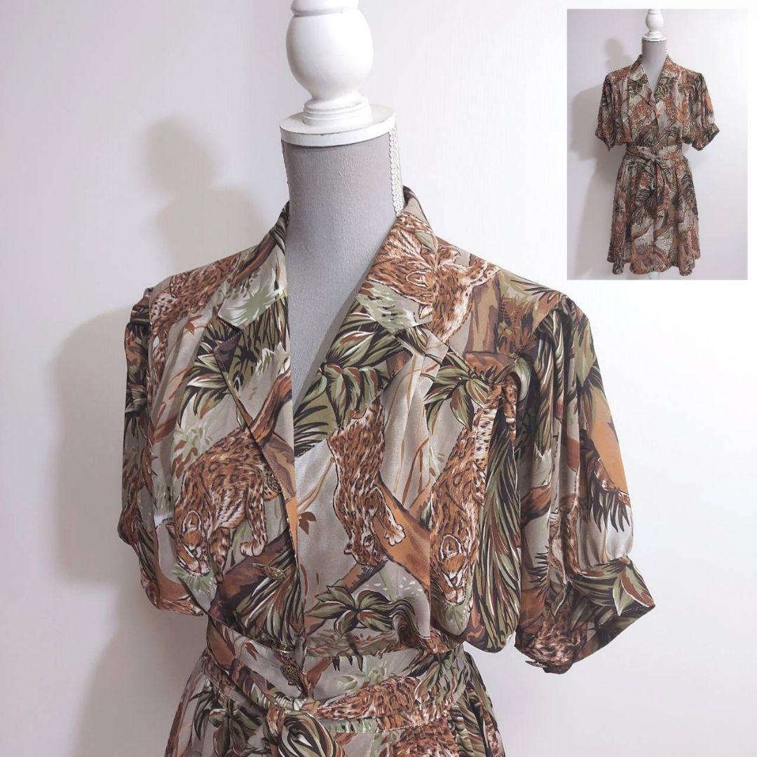 - 山猫・ヒョウ?&リーフ総柄・オープンカラー半袖シャツワンピース 67837