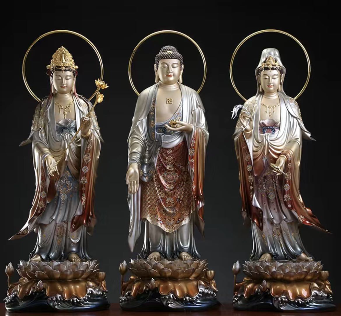 - 【伝世蔵品】中国旧蔵古玩 極細工 銅製 阿彌陀三尊中尊:阿弥陀如来、左脇侍:観音菩薩、右脇侍:勢至菩薩 置物 擺件 古賞物 時代物仏教美術