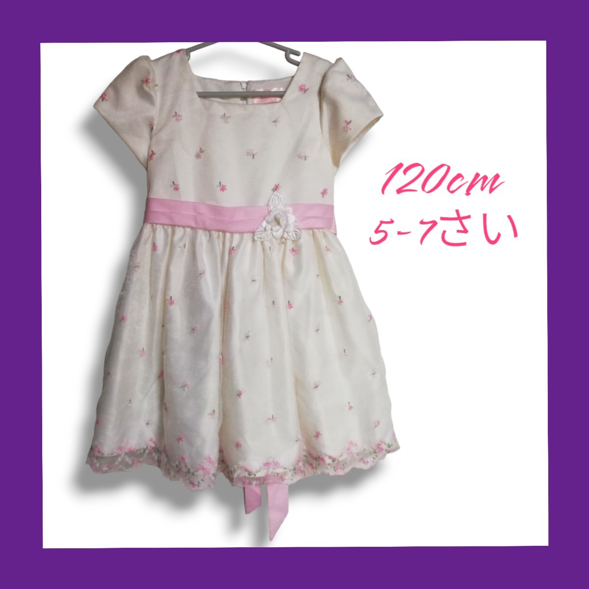 > 【美品】キッズ ドレス 120cm ホワイト ピンク 花 刺繍 レース 発表会 パーティー 結婚式 イベント