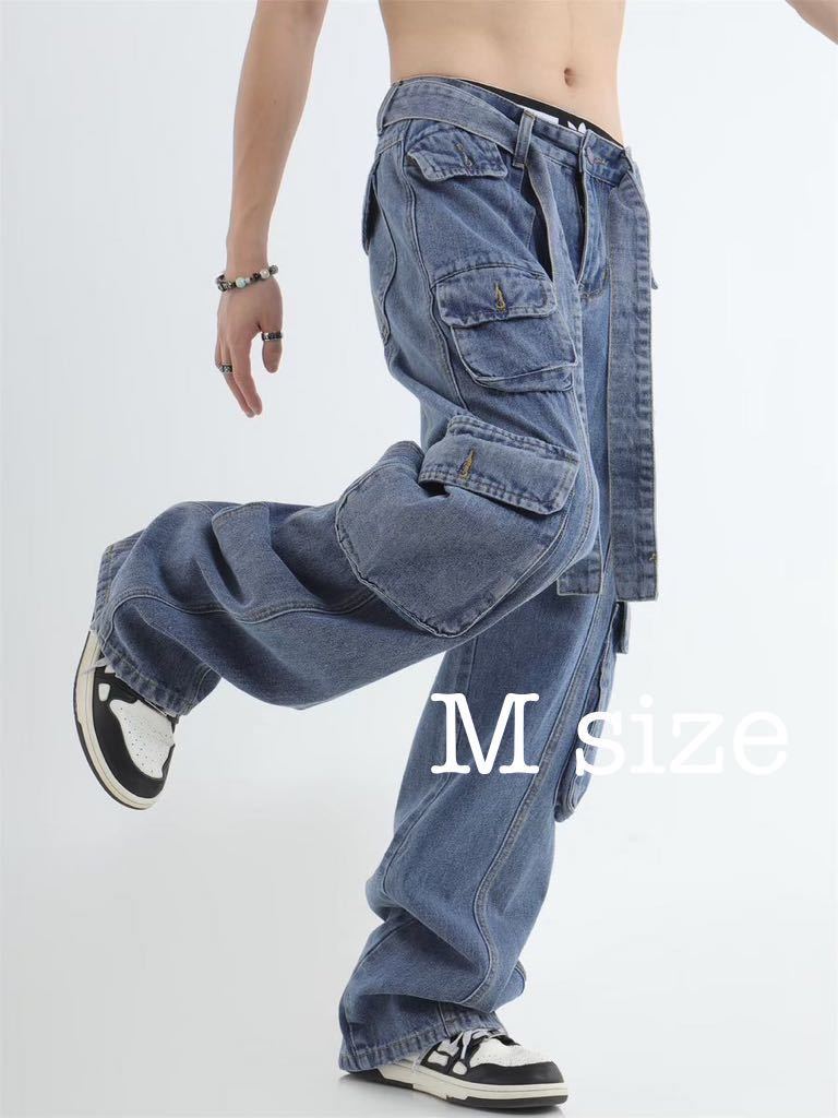- デニム ワイドレッグ ジーンズ ワイドパンツ ワイドデニム ルーズパンツ ボトムス パンツ メンズ レディース ベルト付き 男女兼用 ブルー M