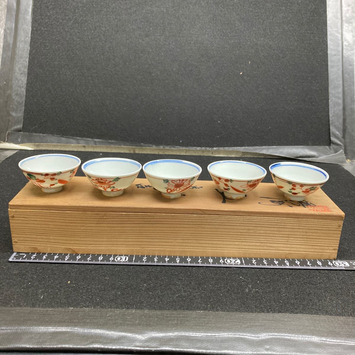 - 京焼き 橘吉造 呉須赤絵 盃 五客組 共箱付き アンテーク 盃に陶印有りません