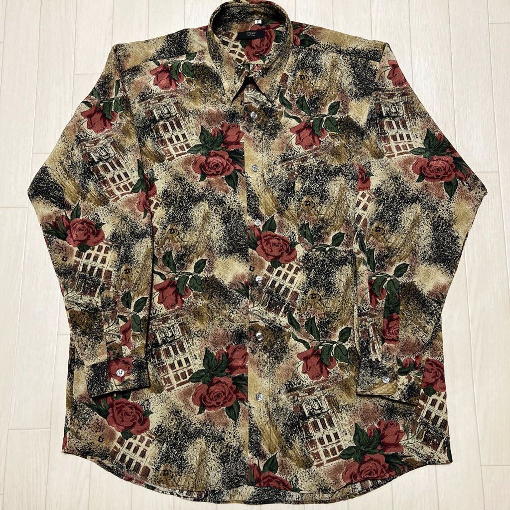 - Vintage homme 総柄 柄シャツ 花柄 薔薇 風景 レトロ アート ビンテージ 長袖シャツ ポリエステル