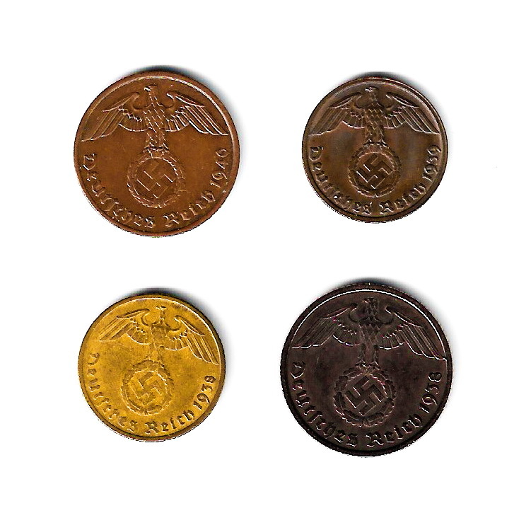 - ドイツ 第三帝国 (鉤十字) - 1, 2, 5, 10 ライヒスペニヒ/青銅貨 黄銅貨★ZD-10
