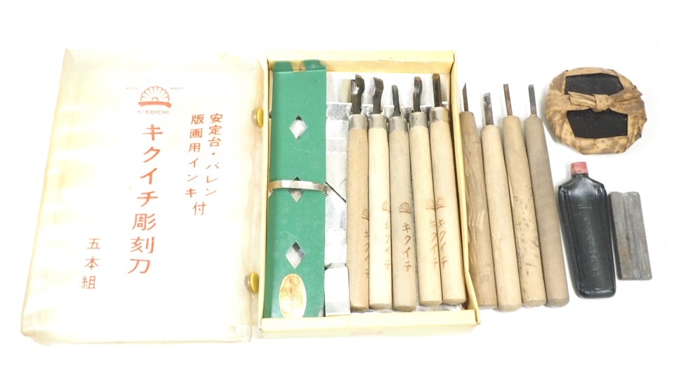 - 昭和ビンテージ 彫刻ナイフ9本と版画制作道具セット キクイチ製 金属製安定台、バレン、版画用インク、砥石、ケース付き 1960年代頃 CKY512