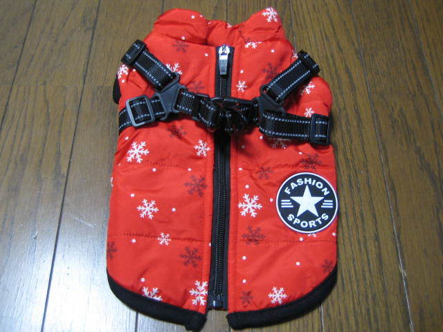 > ■Mサイズ 未使用 小型犬 ハーネス付き ダウンベスト 内側フリース レッドスノー柄■