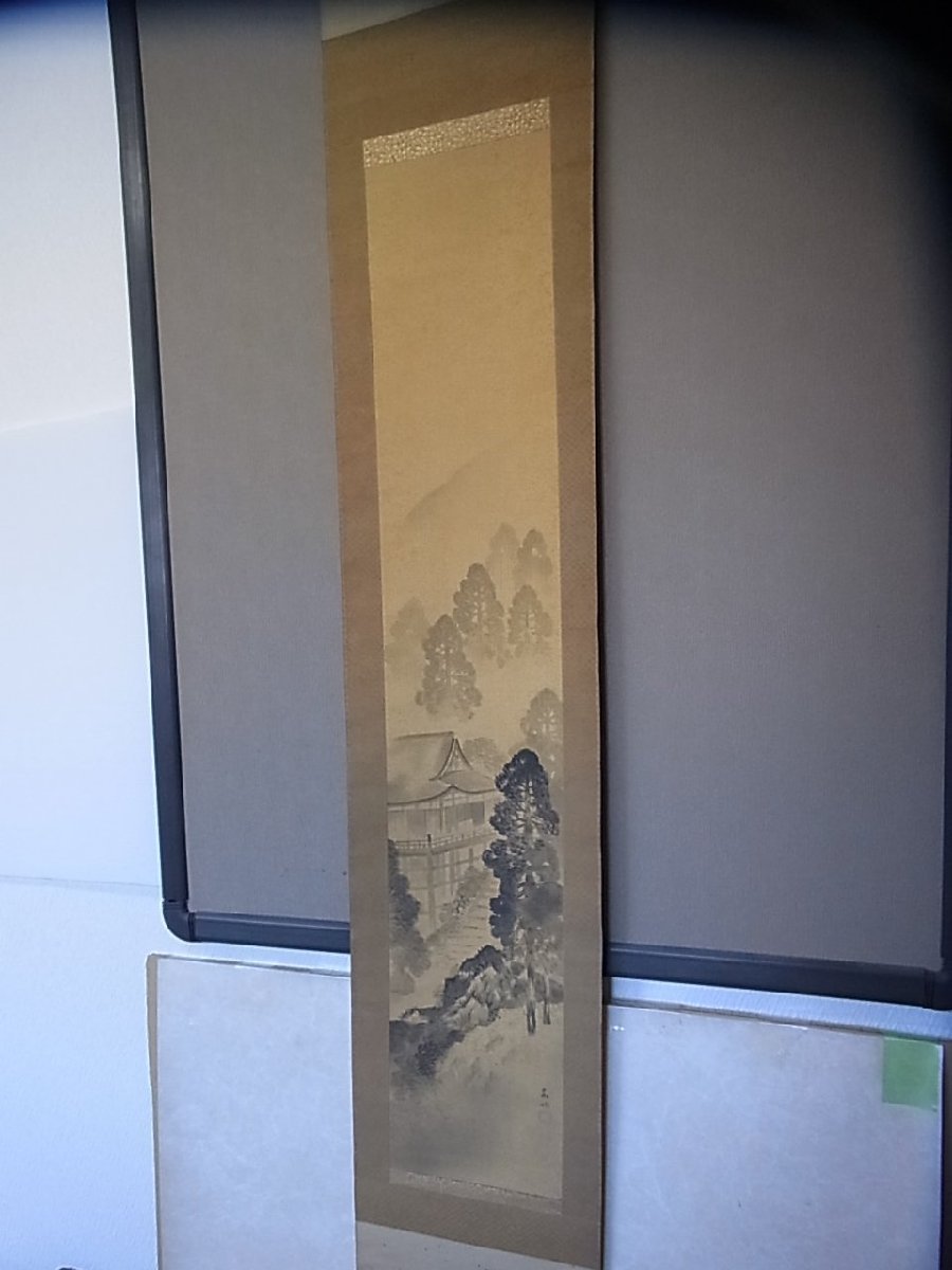 - 【蔵出し】 掛軸 『長谷寺』 山寺風景図 在銘 落款 肉筆 水墨画 高級牙軸 サイズ/29.5×193cm
