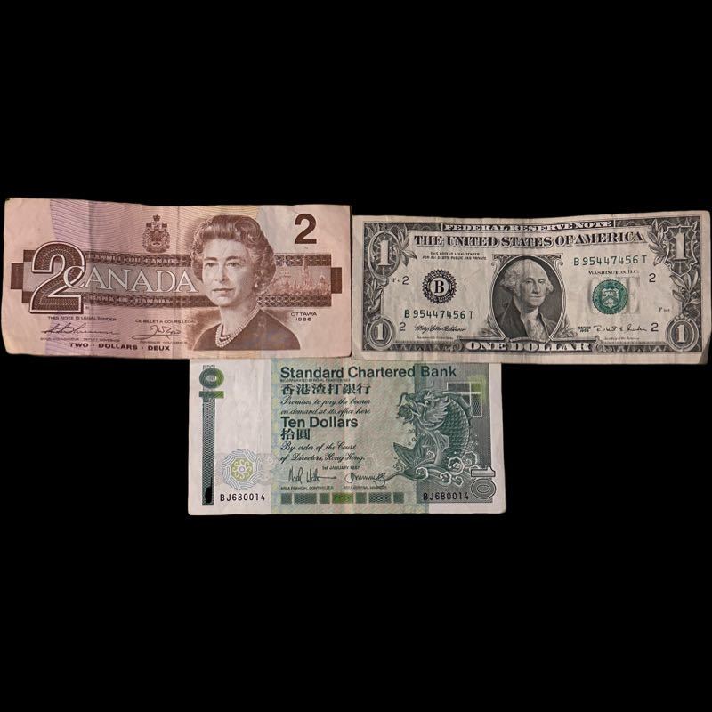 - カナダ2ドル紙幣 アメリカ1ドル紙幣 香港渣打行 スタンダードチャータード銀行10ドル紙幣 3枚セット