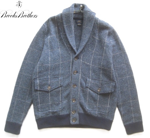 > 美品!!ブルックスブラザーズ Brooks Brothers*ショールネック チェック柄厚手ウールニットジャケット M 紺 ネイビー