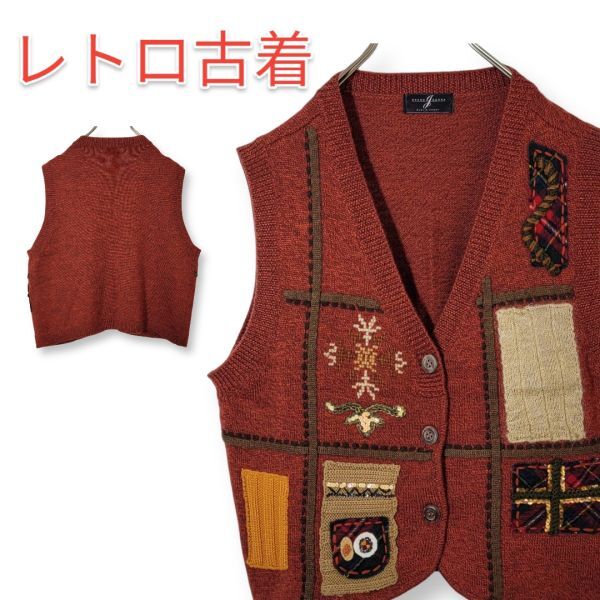 - 【美品】モヘア混 ニット セーター ベスト 赤茶系 レディース 刺繍 ビーズ スパンコール 古着 個性的