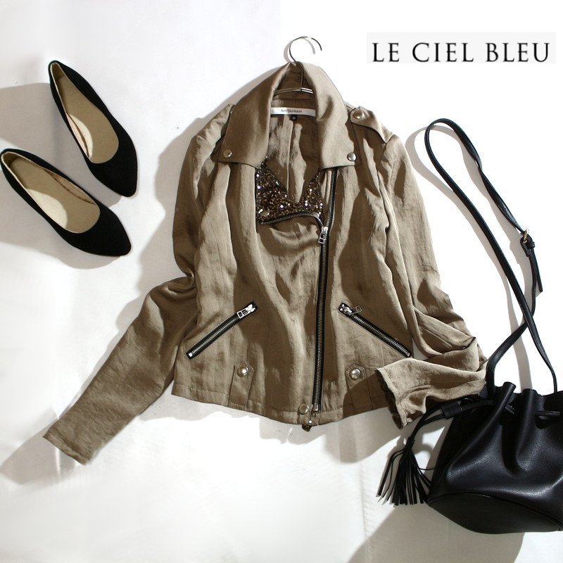 > ルシェルブルー LE CIEL BLEU お洒落 艶サテン スパンコール刺繍 春 ジャケット 38 9号 ブロンズ ベージュ 合物 長袖