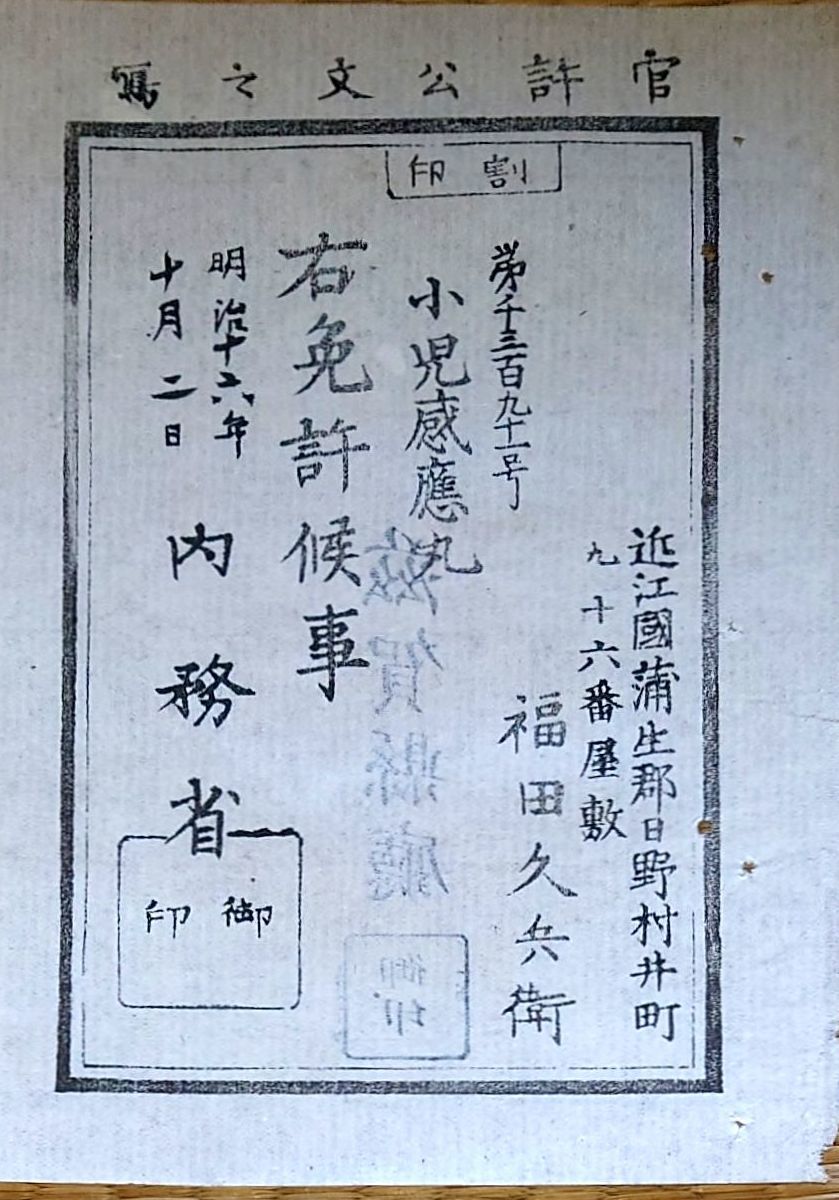 - f24021302〇和紙 木版 薬 小児感応丸 免許 官許公文書写 内務省 近江商人 日野商人 近江国蒲生郡日野村 滋賀県 明治16年〇和本古書古文書
