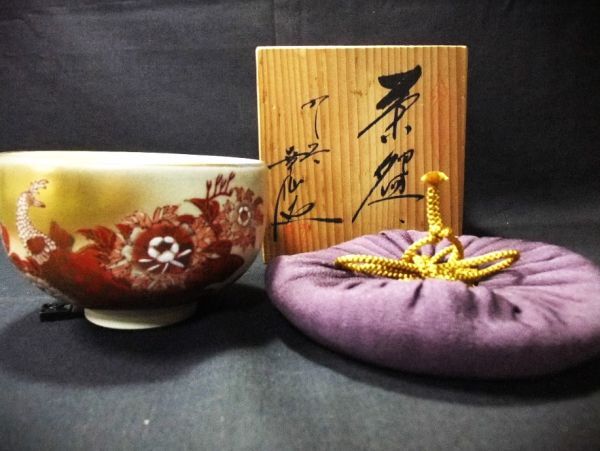 - 【睦】九谷 赤絵 銘「幸仙」米寿 孔雀 花鳥文 盛り上 仕覆付き 茶道具 抹茶茶碗 共箱■
