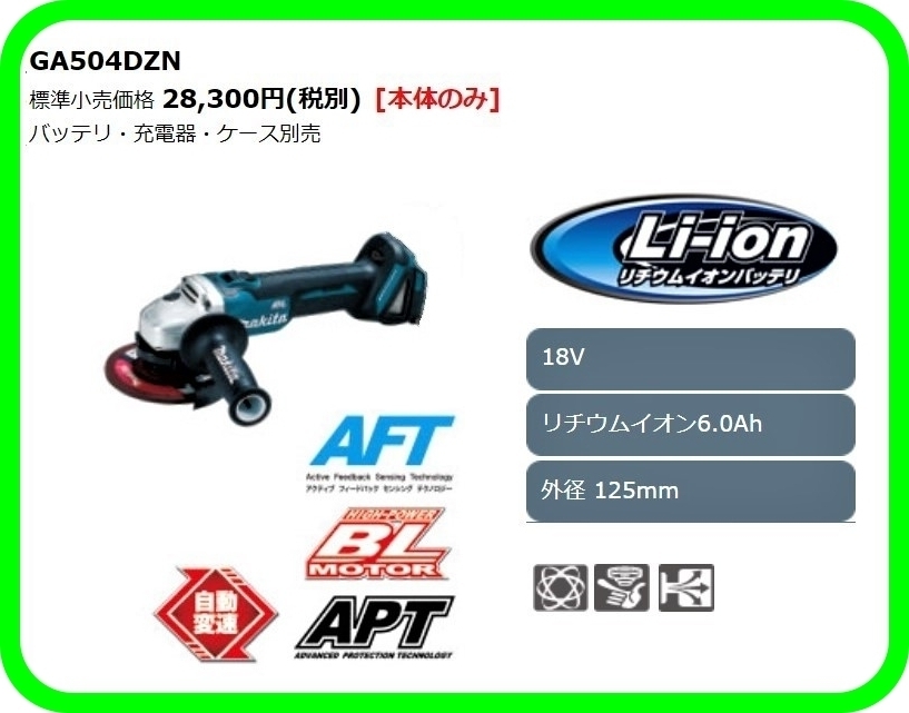 > マキタ 125mm 18V 充電式ディスクグラインダ GA504DZN (本体のみ) ■安心のマキタ純正/新品/未使用■