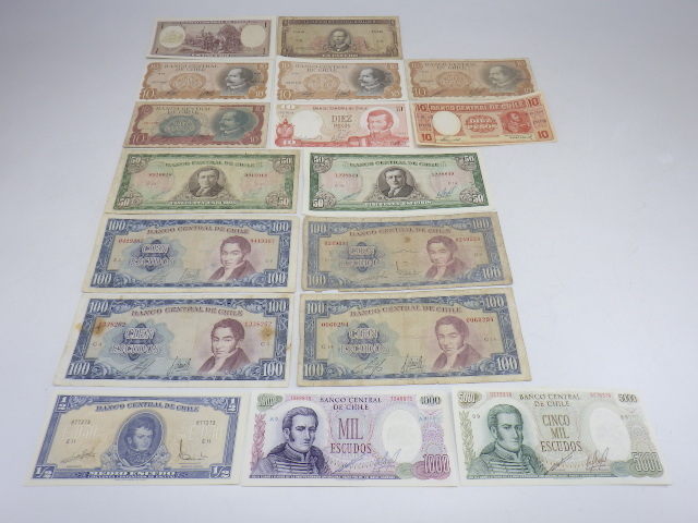- h5B039Z- チリ 旧紙幣 5000・1000・1/2エスクード/100・50・10・1ペソ 計17枚 ピン札有り