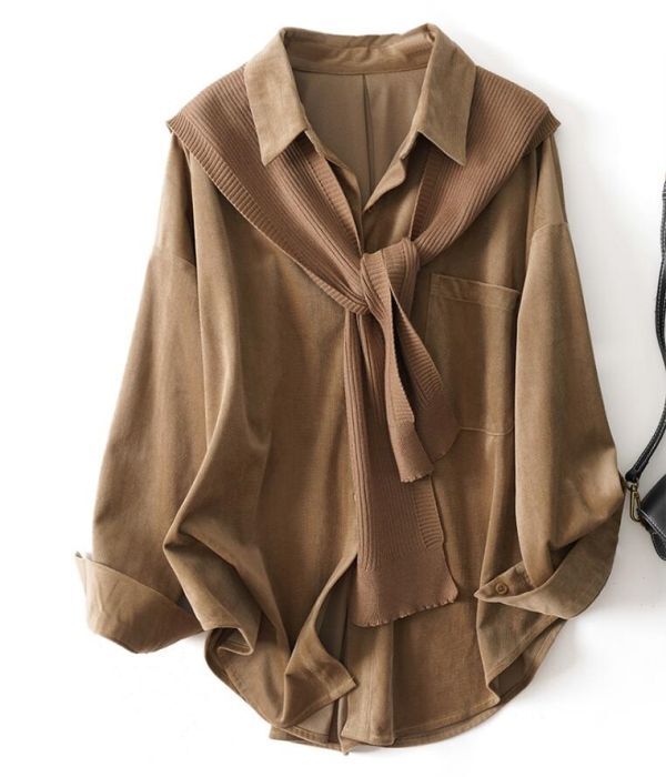 - 春新品/カジュアル トップス ニットポンチョ付き キレイめ 入学式卒業式 ビジネス 長袖 ブラウスシャツ/カーキ/L