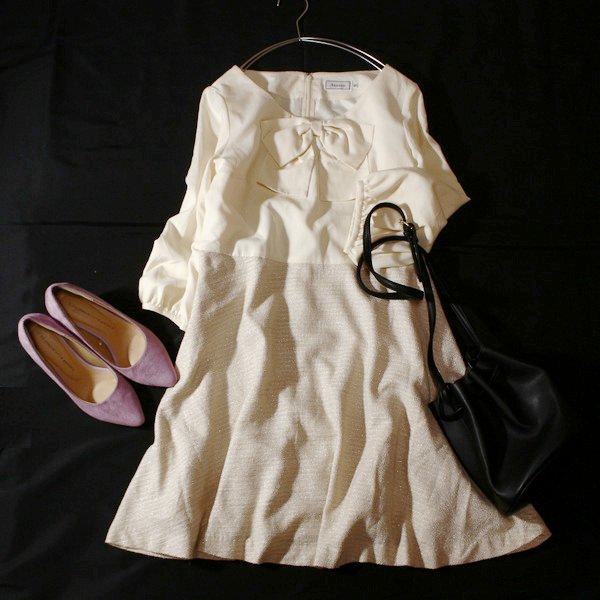- 美品 (株)ワールド anatelier アナトリエ 大人可愛い 異素材切り替え ライトツイード ワンピース 38号 M 春 合服 24A03