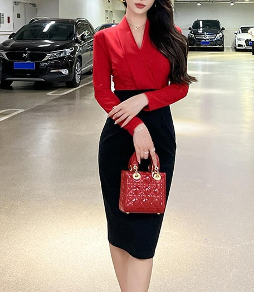 > 2024春季 /タイトワンピース ひざ丈 ミドル丈 パーティドレス セクシー 着痩せ 膝丈ワンピース オフィスレディー 通勤 二次会/レッド/M