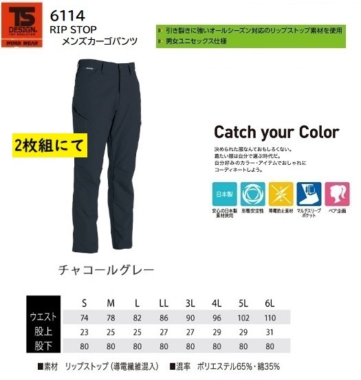 - ビックイナバ特価◆TSDESIGN 6114 RIP STOPメンズカーゴ【25チャコールグレー・5Lサイズ】定価1枚8360円の品が、2枚組で即決2980円