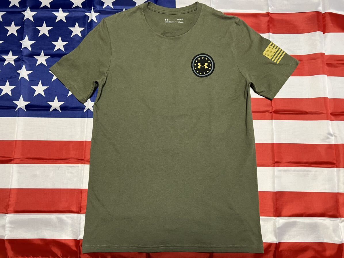 > 中古美品 UNDER AMOUR UNITED STATES OF AMERICA FREEDOM SINCE 1776 HEAT GEAR Tシャツ MEDIUM カーキ