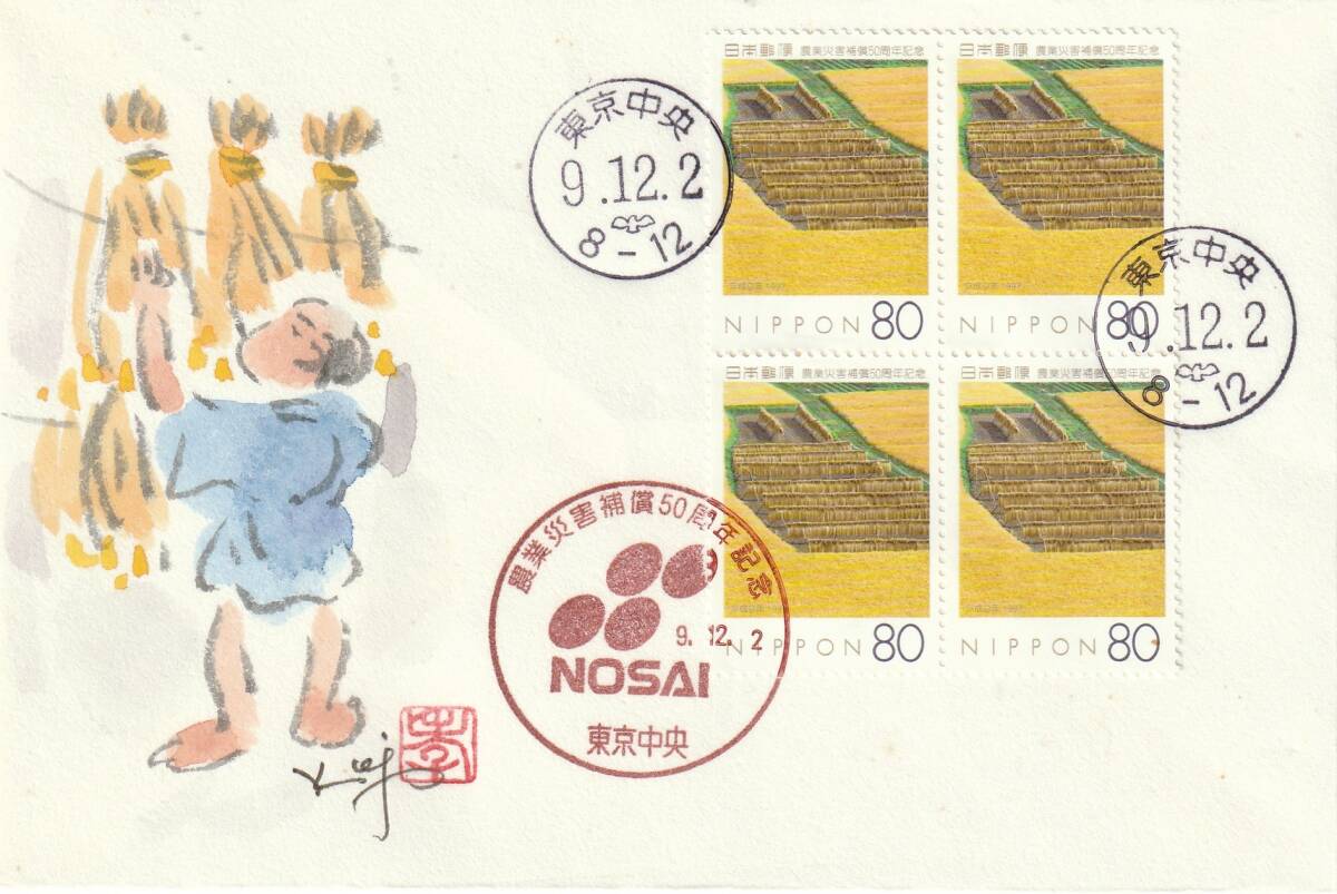 - FDC 1997年 農業災害補償50周年記念 80円4貼2消し 肉筆藤井孝次郎